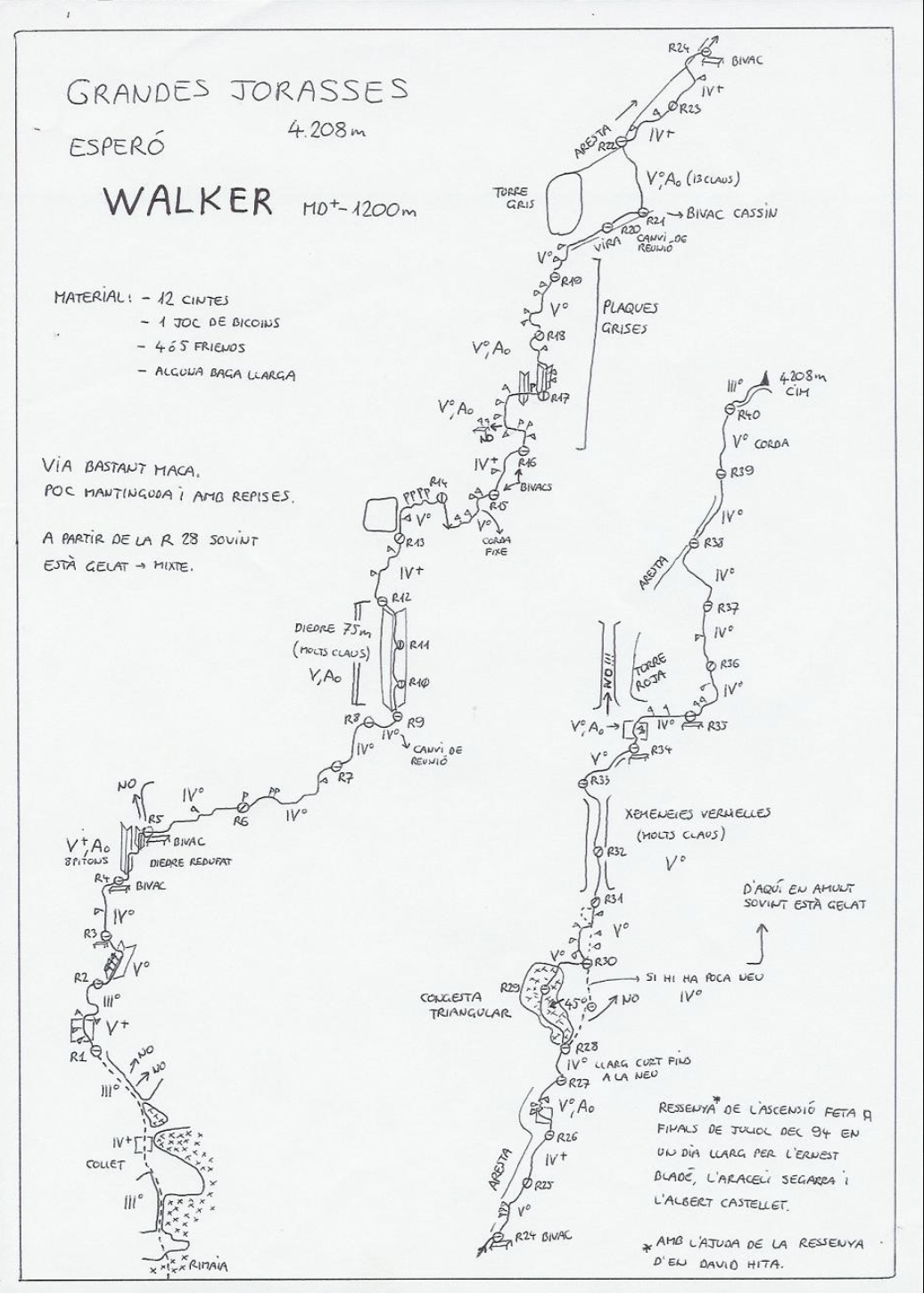 Bivac-korkeus eli yöpymiskorkeus mukana kannettavassa bivac-pussissa määräytyy 2 päivän strategiassa reitin lähtöajan mukaan. Ylempänä olevasta topon kuvasta voi nähdä, että Walker Spur-reitillä on suhteellisen hyvin vaihtoehtoja yöpymiseen. Reitillä ei ole ruuhkaa, tervetuloa kylään!